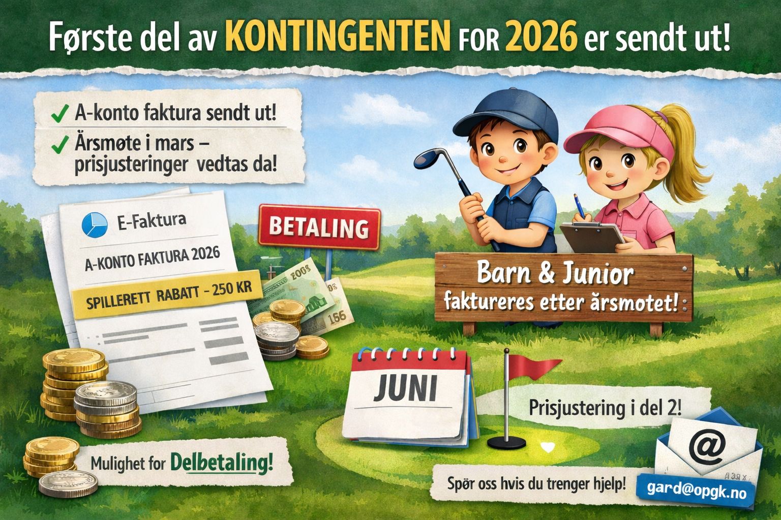 For barn og juniorer sendes det i år ingen faktura nå. De blir i stedet fakturert etter årsmøtet, og vil få én samlet faktura. Som for alle andre kan den selvfølgelig deles opp dersom man ønsker det.